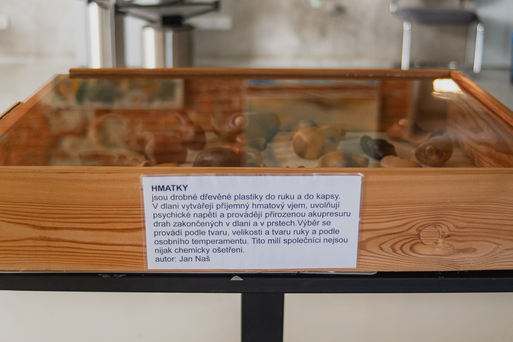 Se dřevem si dobře rozuměl, důvěrně ho znal z původní zahradnické praxe. Byl to pro něj živý materiál, souzněl s ním. Vytvářel šperky, přívěsky, prstýnky, pásky a menší plastiky. Byl také jako první autorem hmatek – drobných plastik do ruky. První vznikla před padesáti lety pro nevidomého kamaráda. Od té doby jich vytvořil několik tisíc, které se dostaly do nejrůznějších částí světa, i za moře.