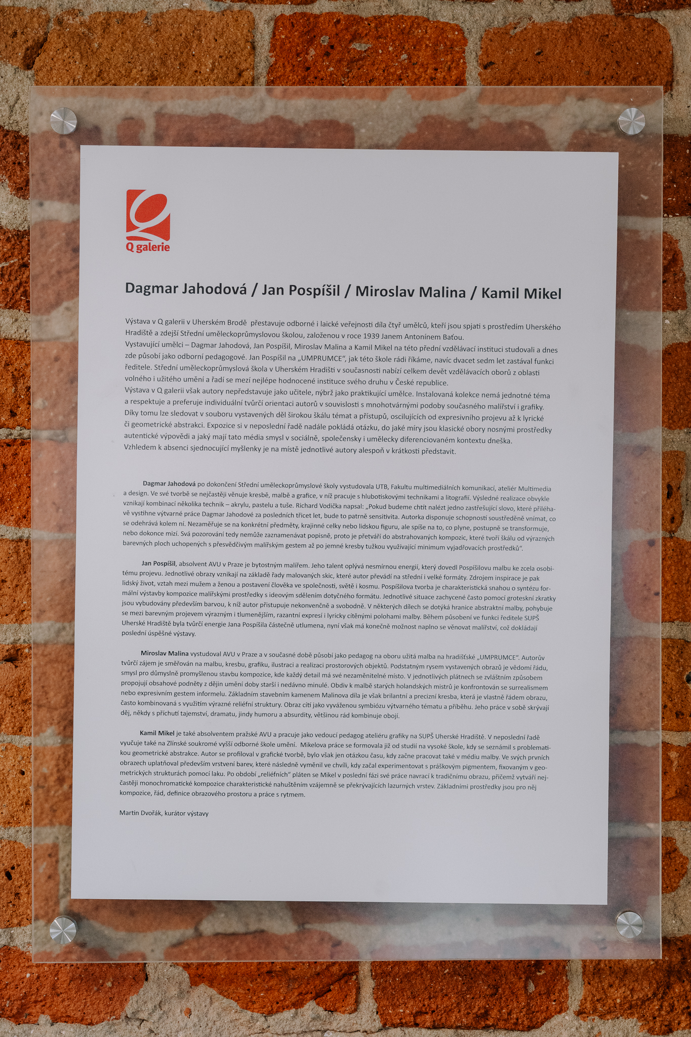 Vystavující umělci – Dagmar Jahodová, Jan Pospíšil, Miroslav Malina a Kamil Mikel – na této přední vzdělávací instituci studovali a dnes zde působí jako odborní pedagogové. Jan Pospíšil na „UMPRUMCE“, jak této škole rádi říkáme, začal učit ještě dříve, než se stal funkci ředitele. Střední uměleckoprůmyslová škola v Uherském Hradišti v současnosti nabízí celkem devět vzdělávacích oborů z oblasti volného i užitého umění a řadí se mezi nejlépe hodnocené instituce svého druhu v České republice.